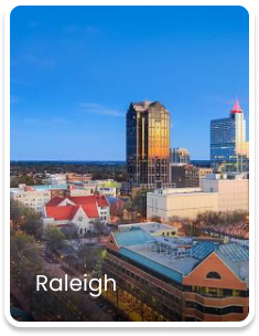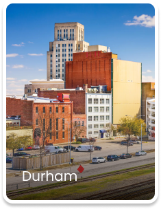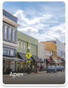 Apex, Angier, Burlington, Carrboro, Cary, Chapel Hill, Clayton, Durham, Fuquay-Varina, Garner, Graham, Hillsborough, Holly Springs, Knightdale, Morrisville, Mebane, Moncure, New Hill, Pittsboro, Raleigh, Rolesville, Sanford, Siler City, Smithfield, Wake Forest, Wendell, Willow Springs, Youngsville, Zebulon.